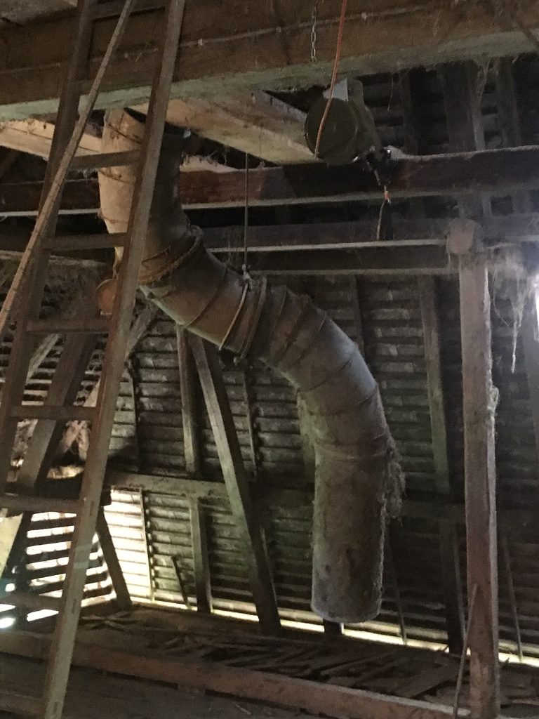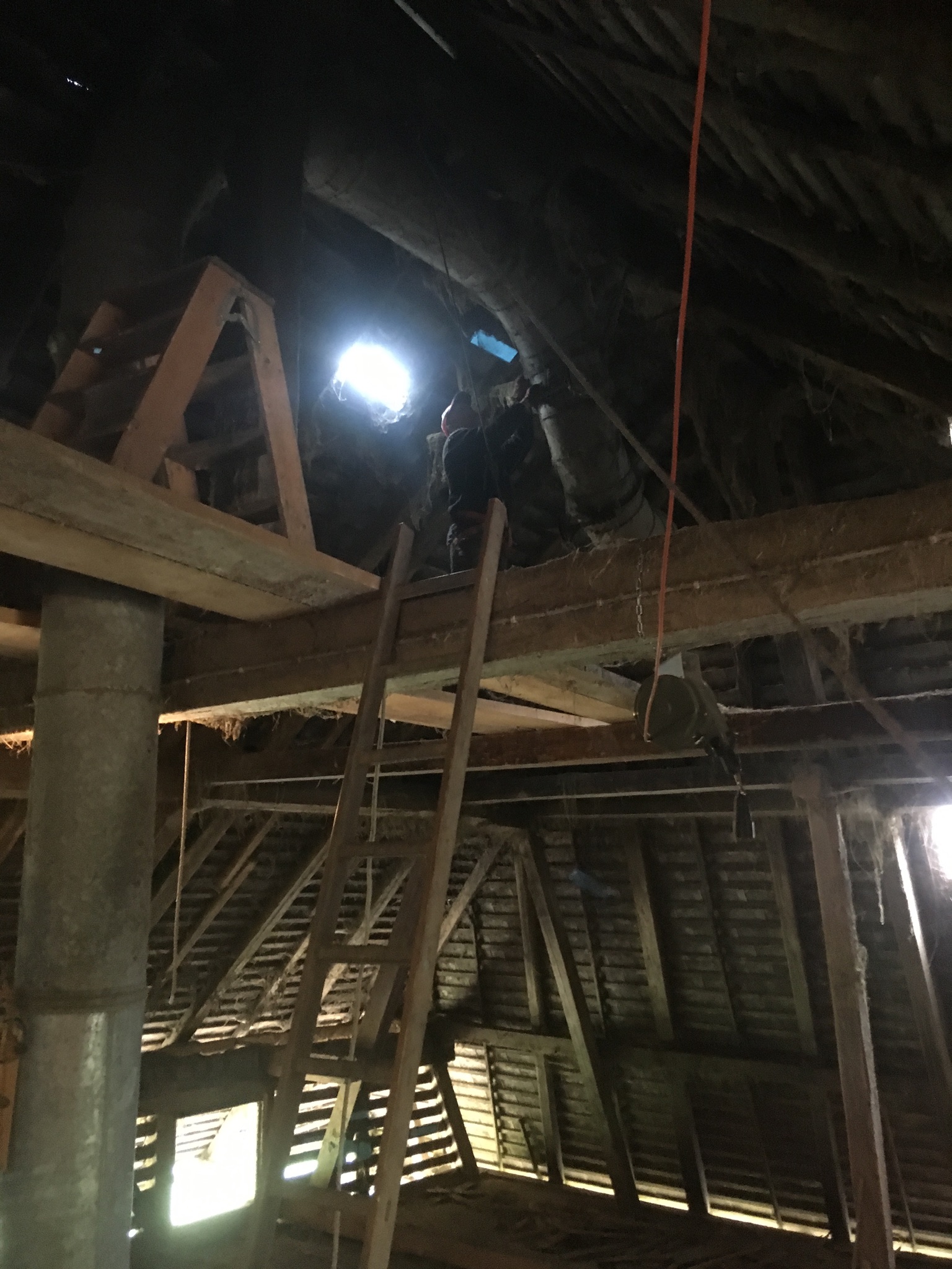 Das dicke Blechrohr des Heugebläses hängt ca. sieben Meter in der Höh‘ an der First, eingepackt in Spinnweben und Staub. Das drum und dran gibt am meisten zu tun, denn mein Mann muss irgendwie an die Schrauben da oben ‚rankommen. Eine lange Leiter führt zu den dicken Laden, die von einem Balken zum andern gelegt wurden, und darauf steht noch eine kleine Bockleiter. Das Rohr muss an der First angeseilt werden, damit es nicht herunterknallt, wenn die Schrauben gelöst sind. Das gleiche gilt auch für Chlöisu…