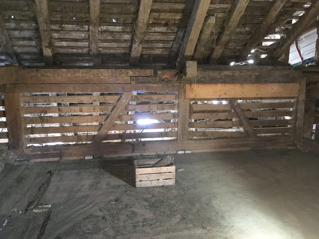 Die alte Chlackwand zeigt sich nochmal. Sieht eigentlich ganz schön aus! Sie war die Heubelüftung der Alten Zeit. Durch die Schlitze drang frische Luft in den Stock und verhinderte ein Überhitzen und vergammeln des Futters.
