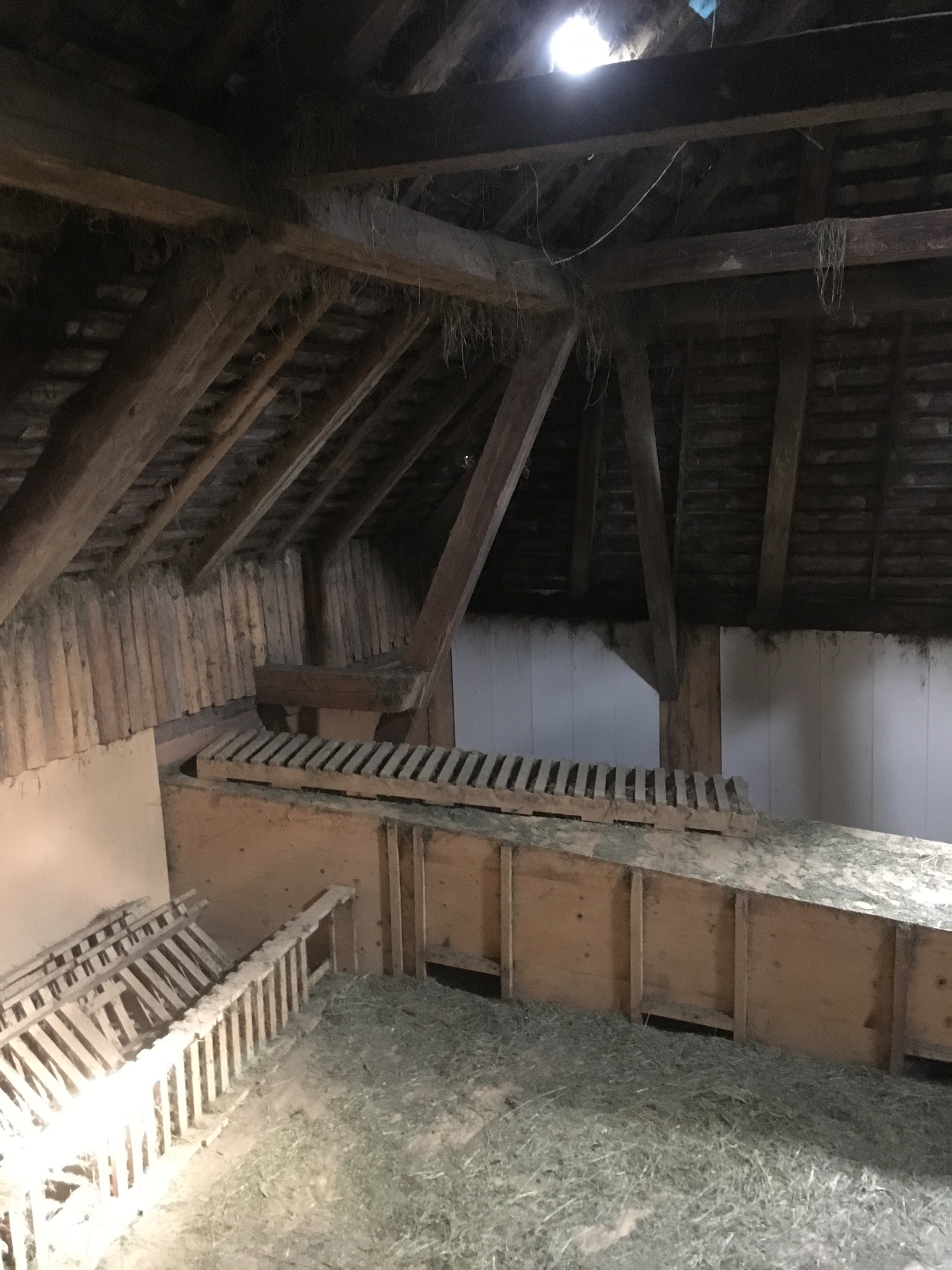 Weit oben, direkt unter der First, hängt noch das Heugebläse. Das muss als nächstes runter…
