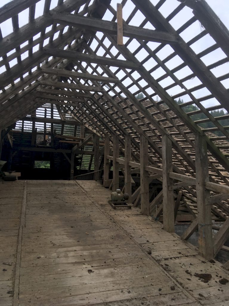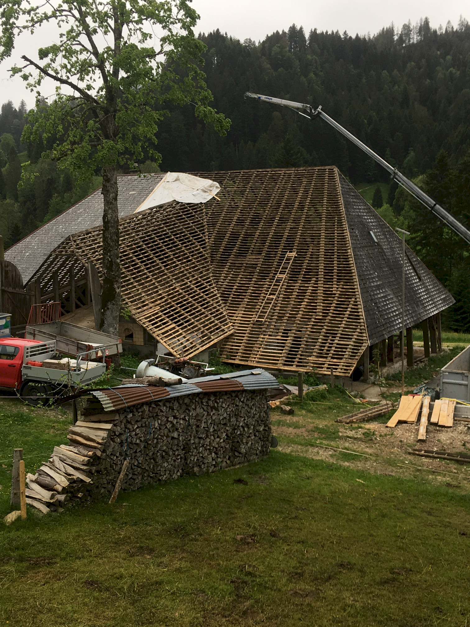 Die schwierigste aller Sprachen ist Zimmermännisch. Mein Mann scheint diese Sprache irgendwann gelernt zu haben, ganz im Gegensatz zu mir. Er gibt sich immer grosse Mühe, mich in die Planung mit einzubeziehen und zitiert mich fast täglich auf die Bühne, um mir eine kleine Planänderung zu erklären. Ich stehe da und versuche den Sätzen, gespickt mit Fachausdrücken, zu folgen. Keine andere Berufsgattung kann so lange Sätze bilden ohne ein einziges verständliches Wort zu verwenden. Da ist die Rede von Binder und Binderlaschen, Sparenpfätte, Kähle, Obergurt,Stütze, Bock und Statik… Ich versteh‘ nur Hölzli… Das heisst, ein Wort habe ich gelernt: Abbinden. Das hat nämlich Chlöisu die letzten paar Wochen in der Zimmerei mitgeholfen. Das Bauholz wird genau nach Plan auf die richtige Länge und Schräge zugeschnitten und die nötigen Löcher und Aussparrungen gemacht. Eben abgebunden. Logisch oder? Nun gut, ich glaube zimmermännisch lerne ich wohl nicht. Ich nehme aber an, dass es den Handwerker sowiso lieber ist, wenn ich mich um das Kochen kümmere, anstatt auf der Baustelle rum zu lümmeln. Aber jetzt sind sie noch nicht da, Grund genug mir das Gebälk noch mal genauer anzusehen. Es gibt nämlich eingangs Trub ein Haus, das dem Unseren sehr ähnlich sieht. Nur der hintere Teil ist kleiner und die Dachneigung etwas flacher abfallend. Ich vermute aber, dass unser Haus wesentlich früher abbrannte, so um 1860 und um 1904-1911 ein Anbau stattfand. Das würde die angesetzte First und die unlogischen Aussparrungen an den alten Balken und die unterschiedliche Machart der Hölzer erklären! Auch die Einfahrt zur Bühne wurde zu dieser Zeit wohl verbreitert und das Dach teilweise neu gedeckt und etwas vergrössert. Ich stelle mir vor, dass der damalige Bauer äusserst Fortschrittlich war, nur so kann man sich die für diese Zeit riesige Einfahrt erklären. Leider verunfallte der Bauer kurz darauf 1912 tödlich und ein Jahr später verstarb auch seine Frau. Die noch sehr kleinen Kinder wuchsen in der Folge bei Gotte und Götti in der Nachbarschaft auf. 20 Jahre wurde der Hof von Pächtern bewirtschaftet, bis der zurückgebliebene Bauerssohn 1932 mit seiner jungen Frau wieder zurückkehren konnte. Ist es nicht erstaunlich, wie gut die Schweiz diesbezüglich schon vor 100 Jahren funktioniert hat?