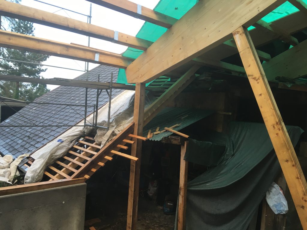 Genau von dem Tag an, als ein grosser Teil des Wohnhauses abgedeckt wurde, um Alt und Neu zu verbinden, stellte sich wechselhaftes Wetter ein. Natürlich wurde alles so gut wie möglich mit Planen abgedeckt, der Neubau blieb aber grösstenteils offen, die Fläche war einfach zu gross.