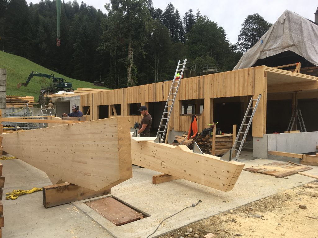 Diese Elemente wurden in den letzten Tagen gefertigt, riesige Holzflächen, die in dieser Woche zu einem kompletten Gebäude zusammengezimmert werden sollen. Im Klartext heisst das, nach 19 Wochen Bauzeit wird unser altes Haus in einigen Tagen ein neues Hinterteil haben! Natürlich dauert es nach dem Aufrichten noch ein paar Wochen bis alles fertig ist, eine weitere riesige Etappe wird aber schon sehr bald abgeschlossen sein.